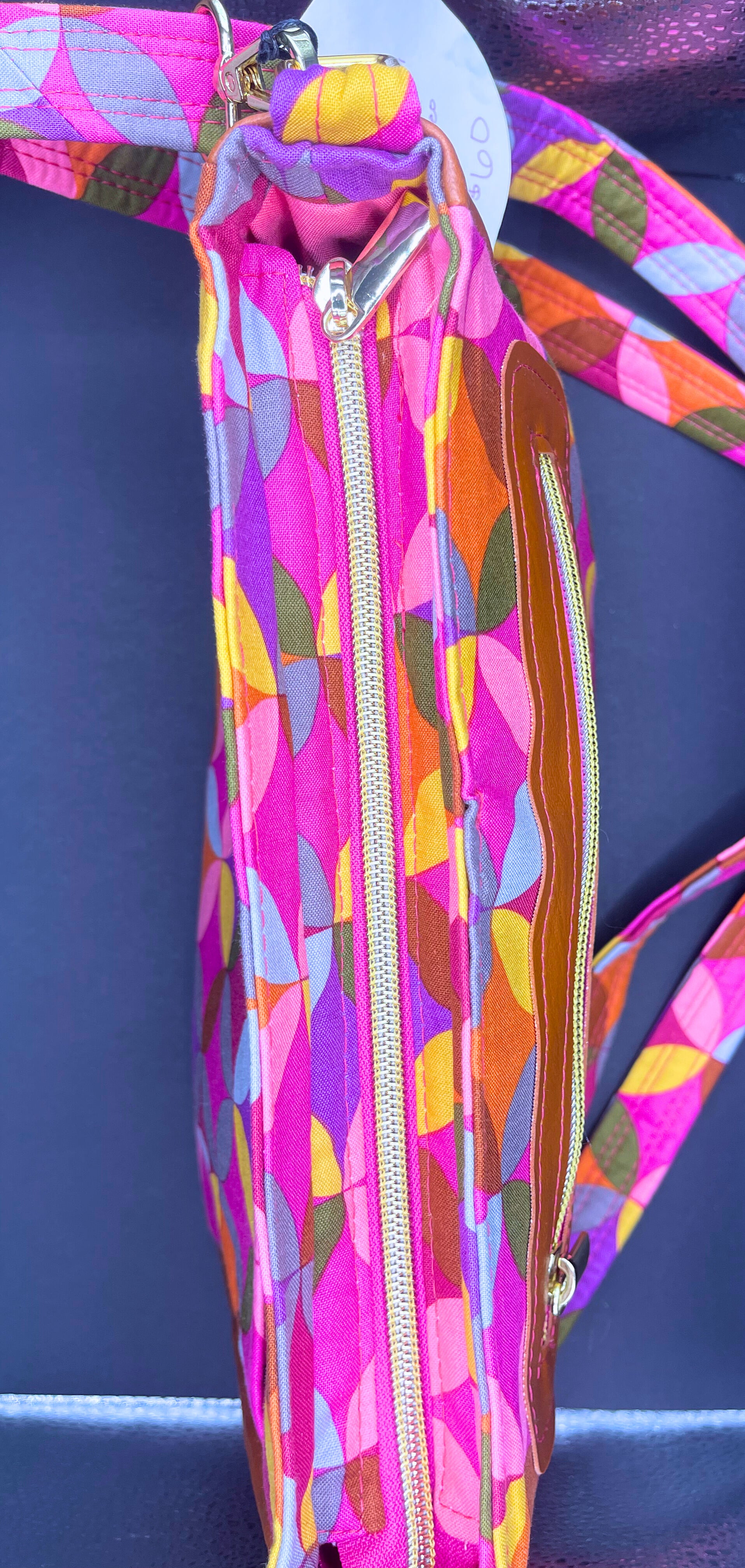Abstract is a State of Mind features a pink geometric patterned cotton and camel vinyl exterior, a pink cotton interior, and gold hardware.