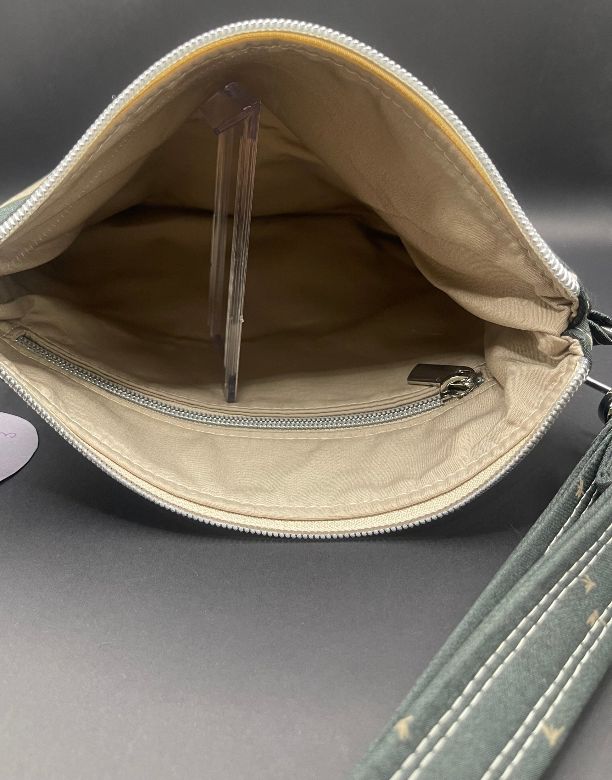 Date with a Dragonfly has a charcoal-based cotton and tan vinyl exterior, a tan interior, and silver hardware.