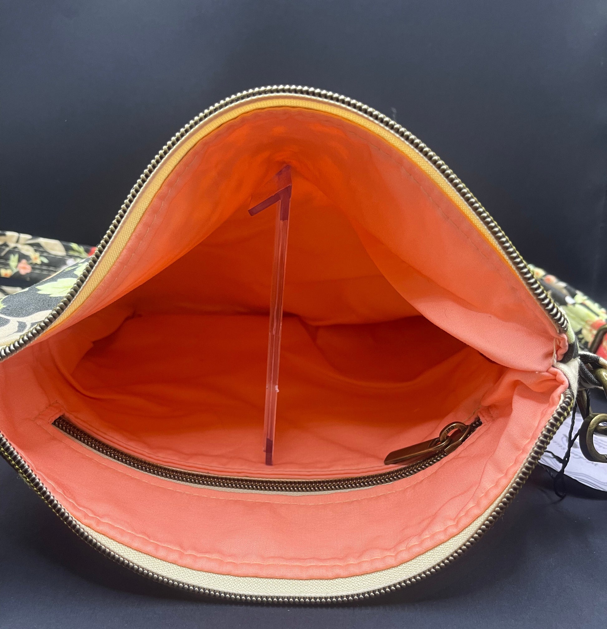 Our Alyssa is equipped with a fully adjustable strap, an interior zipper pocket, and a fully zippered main closure, keeping all of your contents secure. The exterior is made of both cotton and vinyl, while the interior and strap are made of cotton.