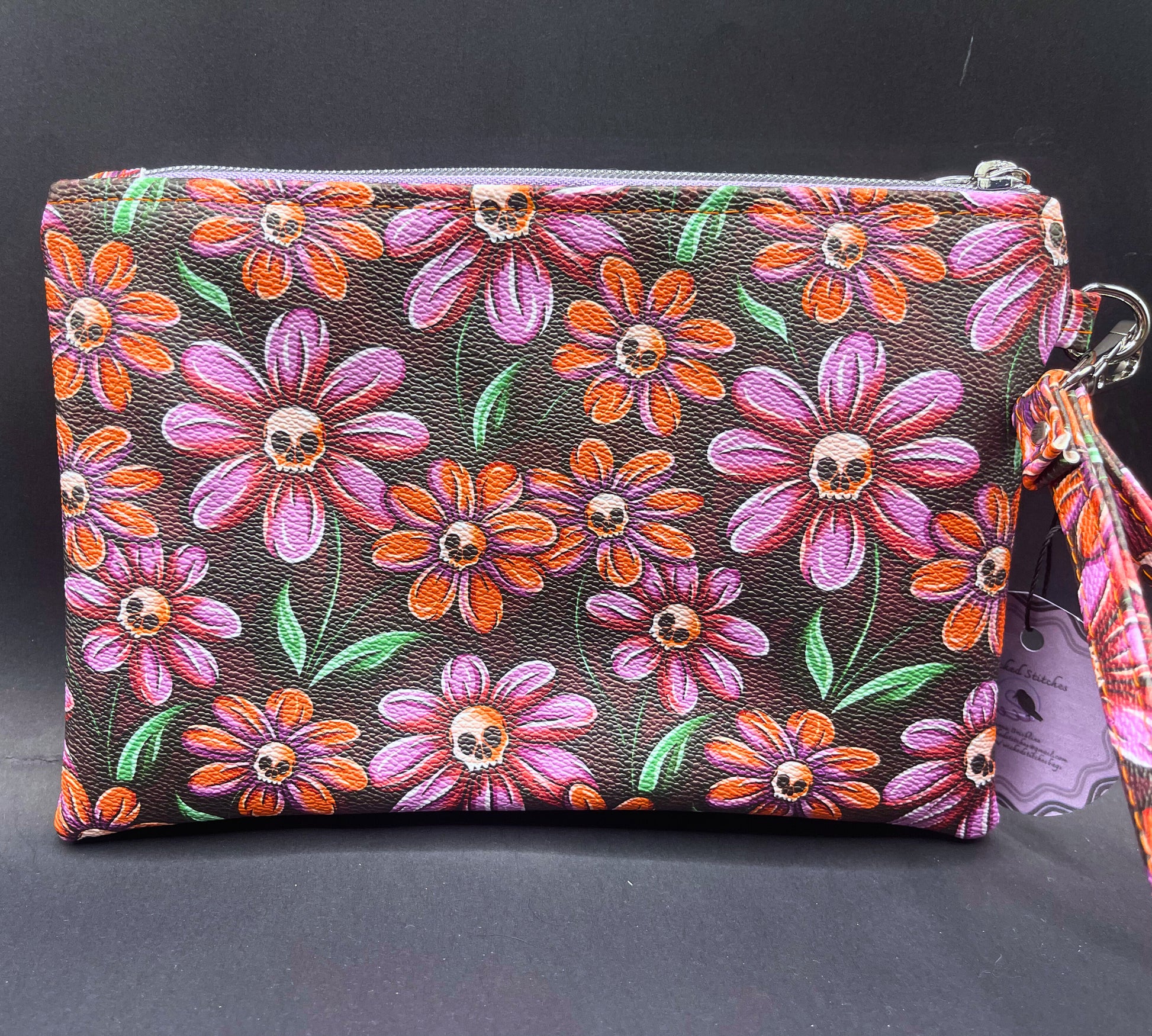 But What Brings Halloween Flowers? features a black and floral-printed vinyl exterior, an orange cotton interior, gunmetal hardware, and even a skull zipper pull!