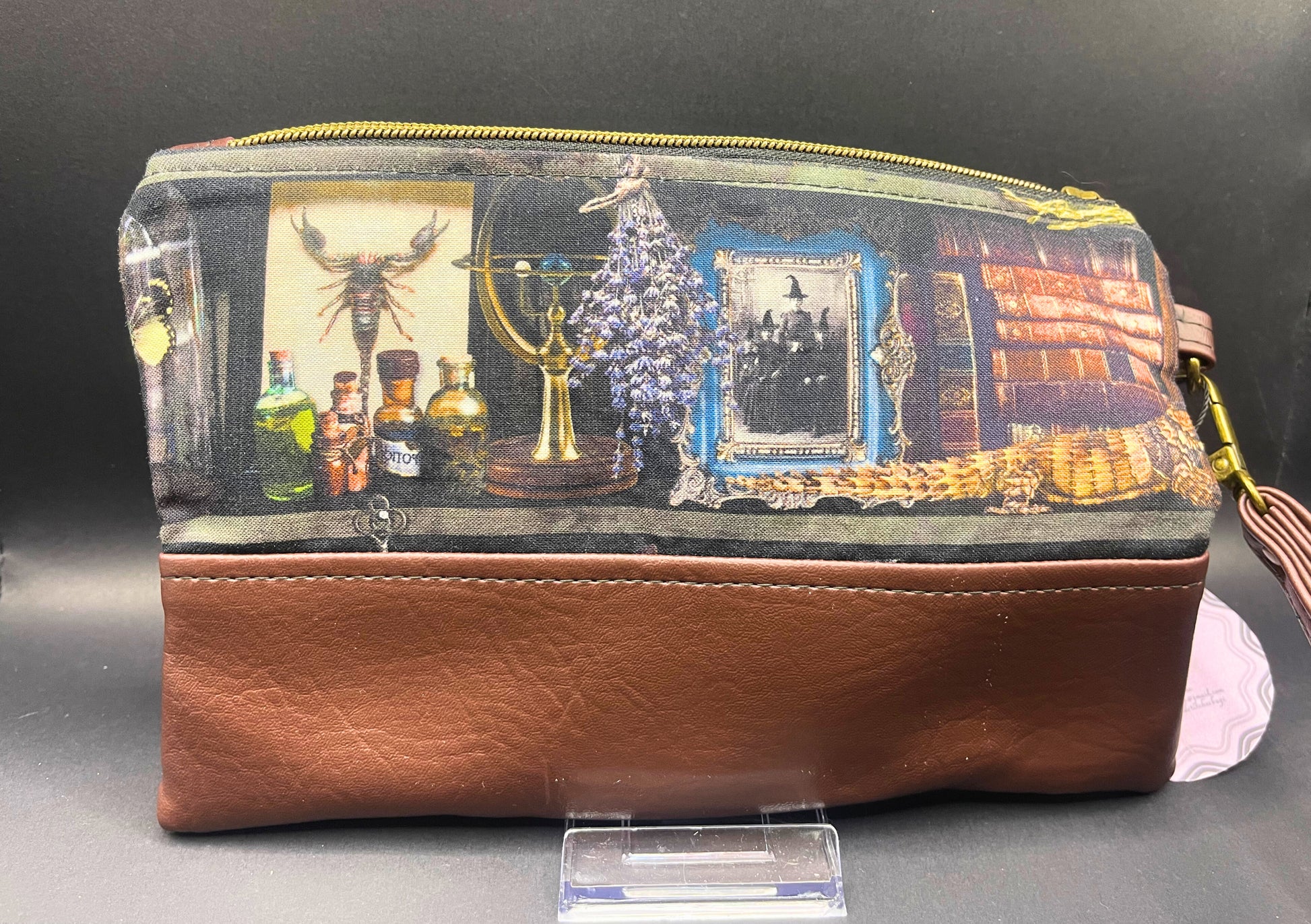 Witch Way to the Apothecary? features a witchy/apothecary printed cotton and brown vinyl exterior, a black cotton interior, and antique brass hardware.