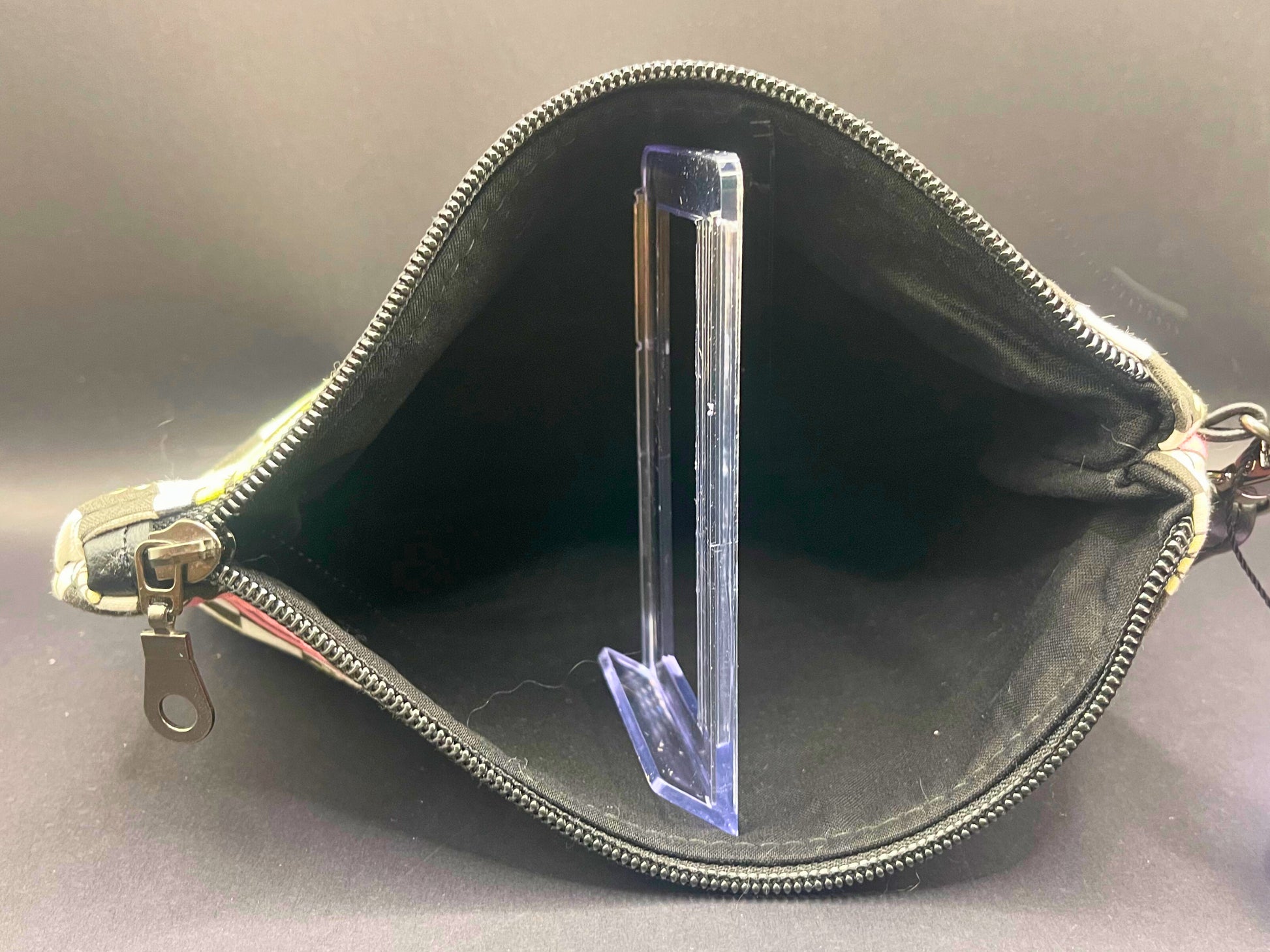 Our 90's Throwback Artemis features a printed cotton and black vinyl exterior, a black cotton interior, and silver hardware.