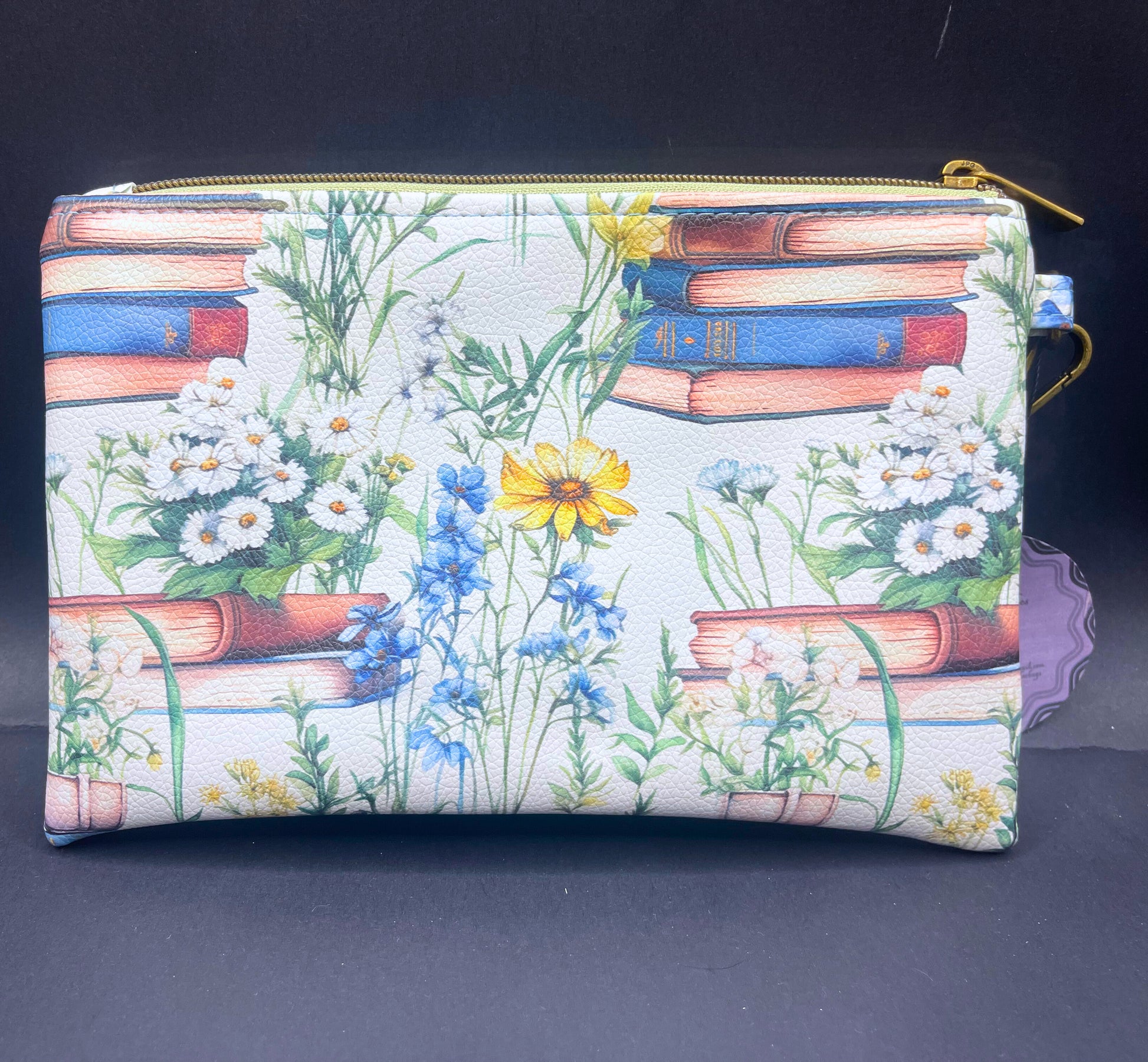 Our A Bibliophile's Dream Artemis features a vinyl exterior covered in florals and books, a bluebell cotton interior, and antique brass hardware.