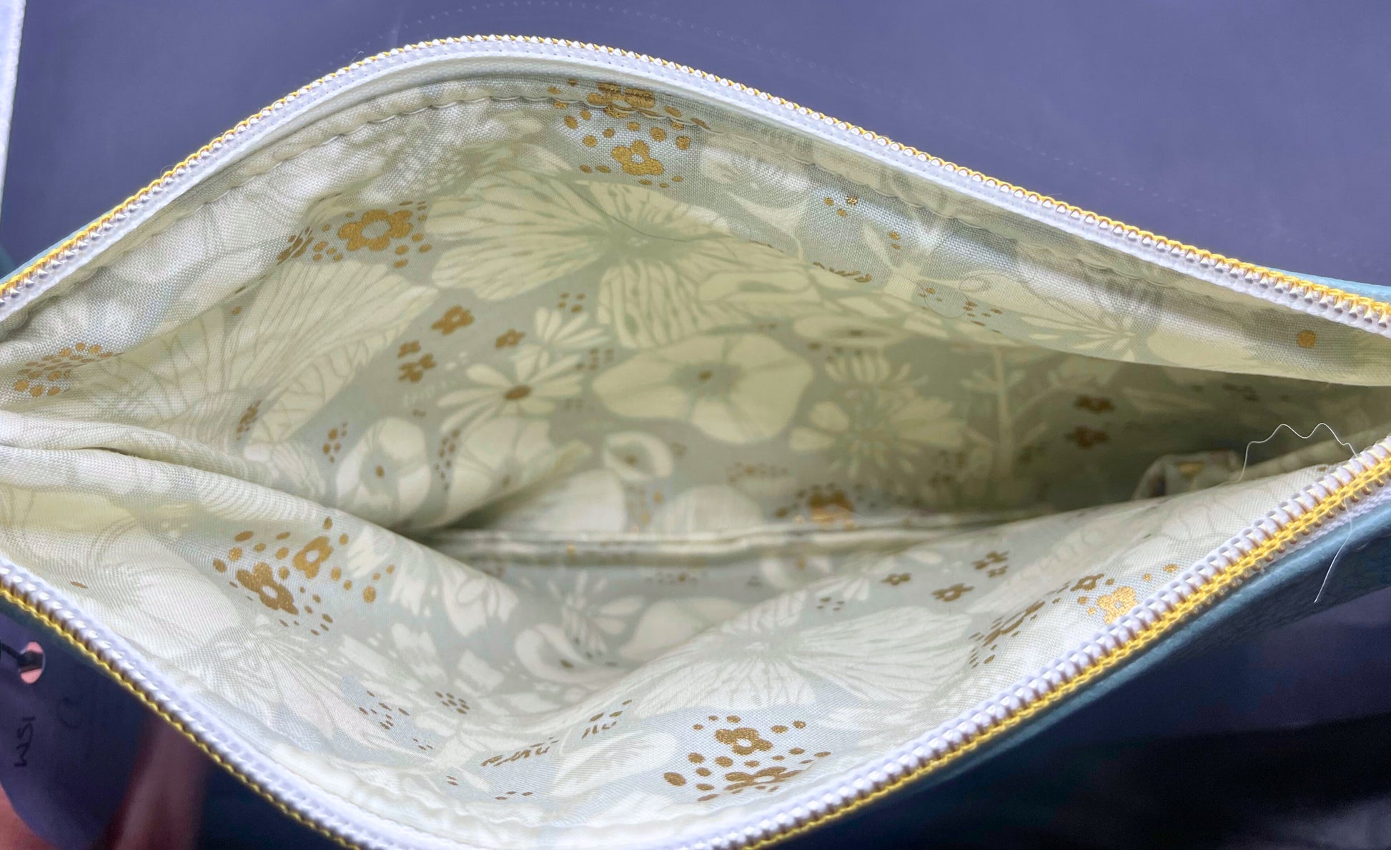Our Robin's Egg Artemis features a beautiful robin's egg blue vinyl exterior, a cream floral cotton interior, and gold hardware.