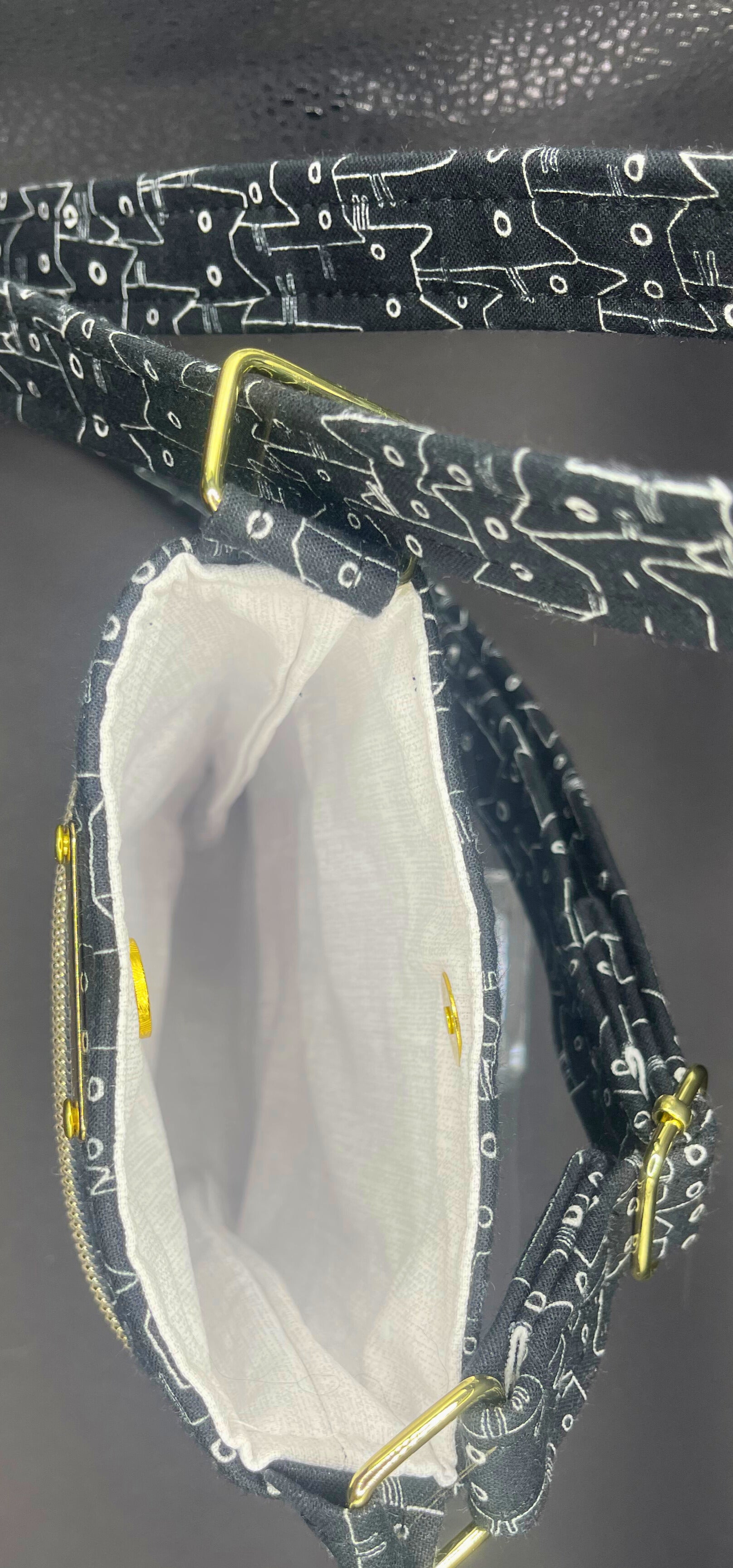 Feline Frenzy has a cat-patterned cotton exterior with a black vinyl bottom, a white cotton interior, and gold hardware.