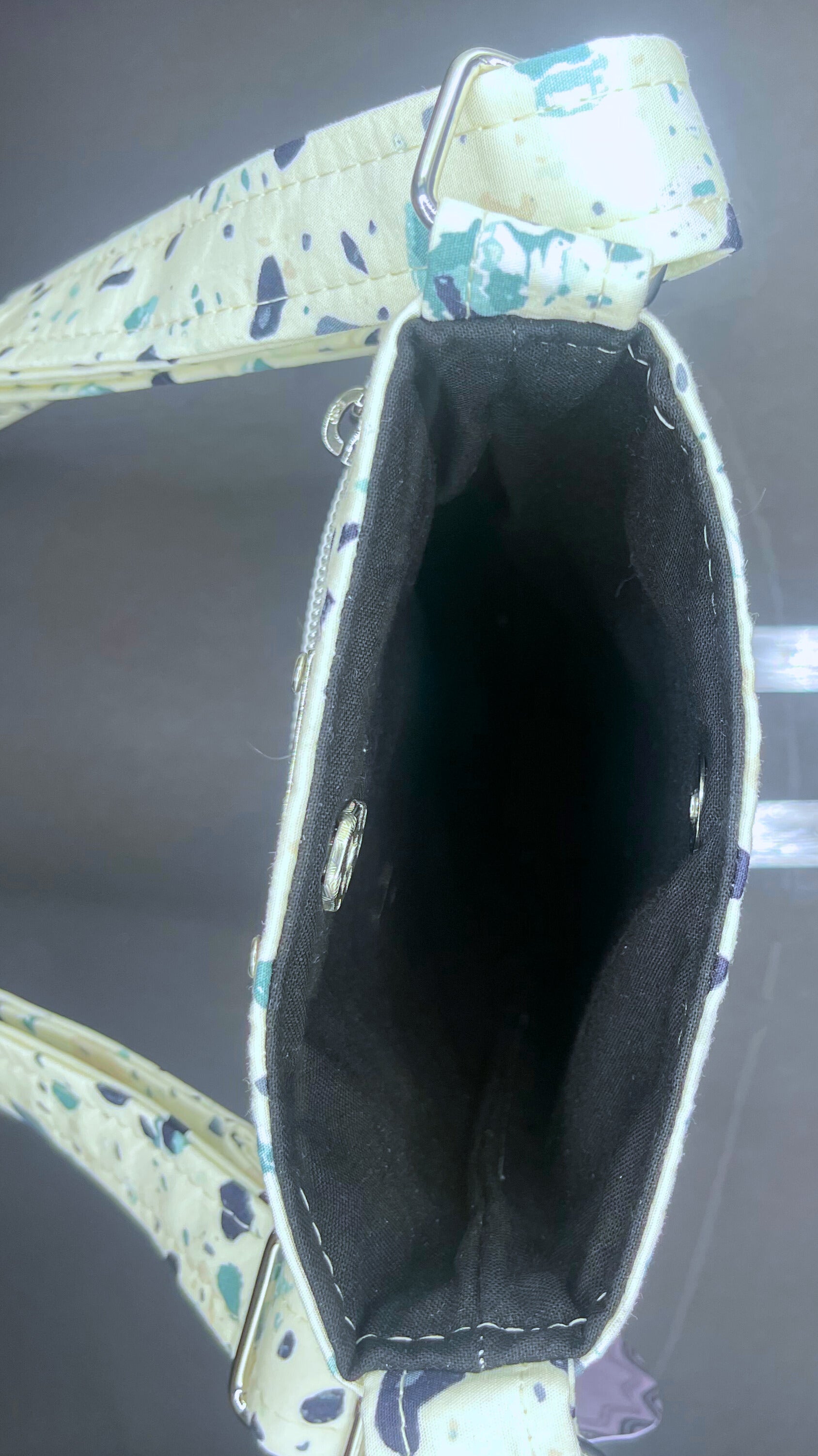 Terrific Terrazzo has a base color of white, with navy, teal, and black accents, a black bottom and interior, and silver hardware.