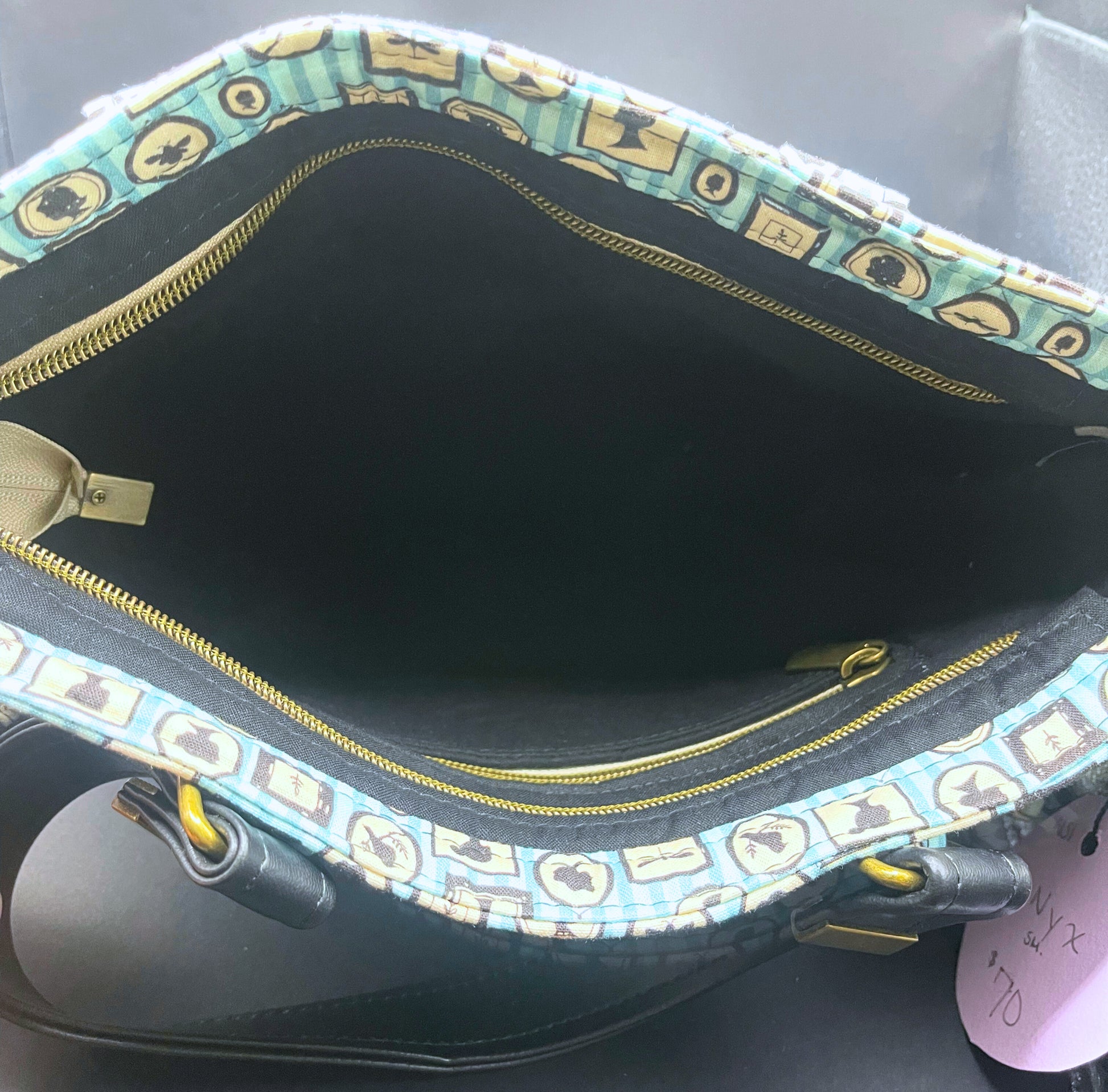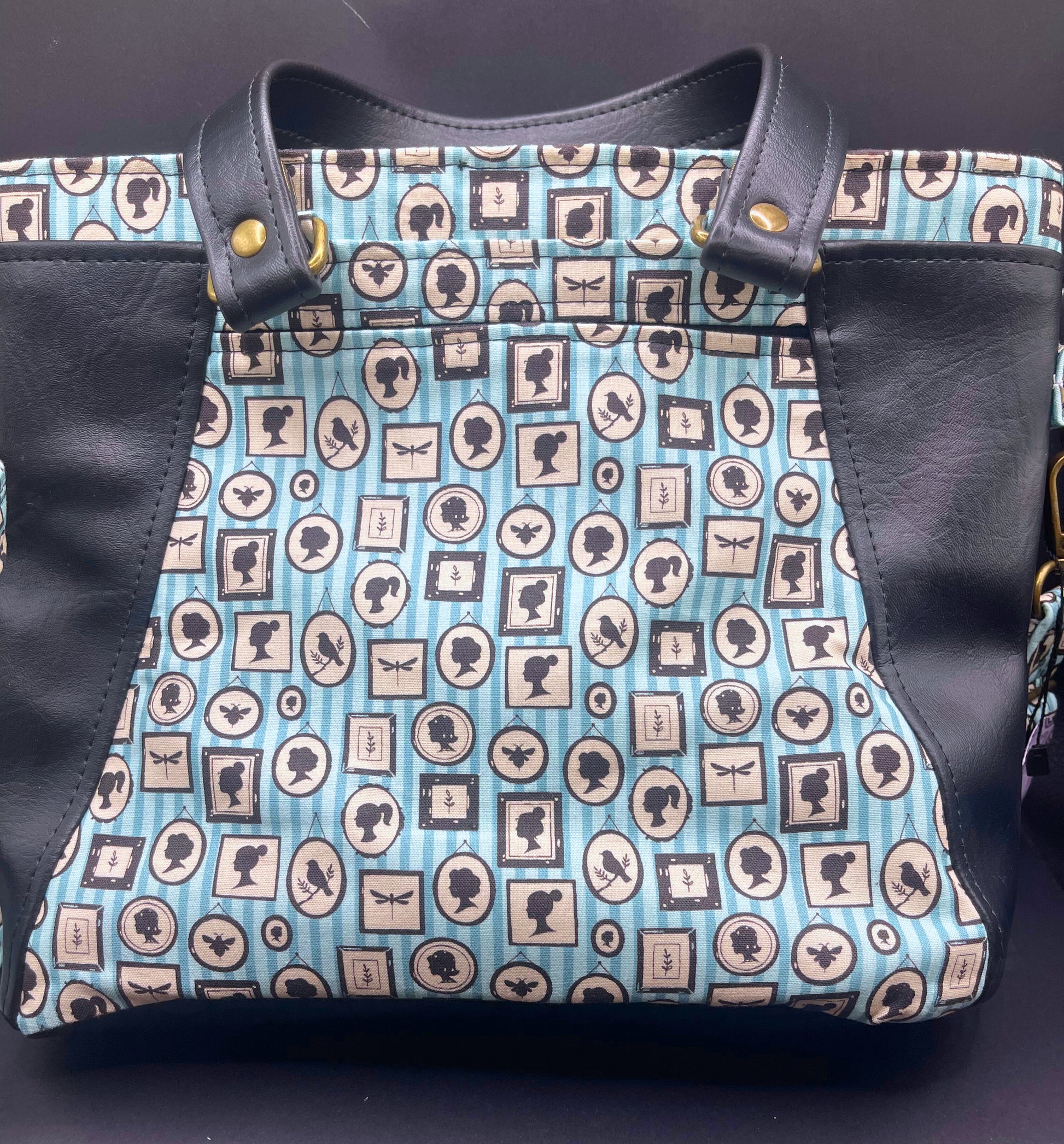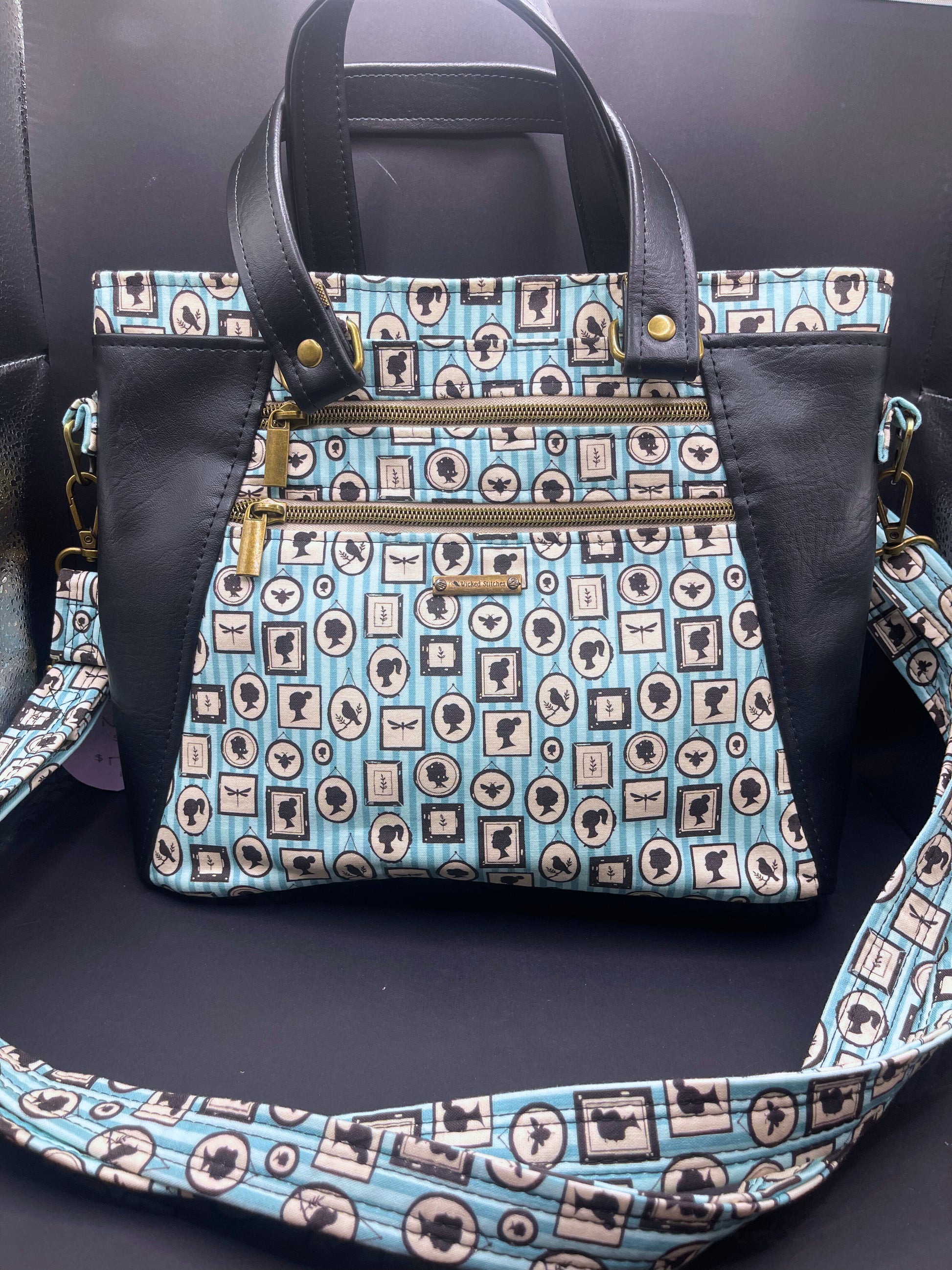 Look at this Photograph features a blue cameo- printed cotton and black vinyl exterior, a black cotton interior, and antique brass hardware.