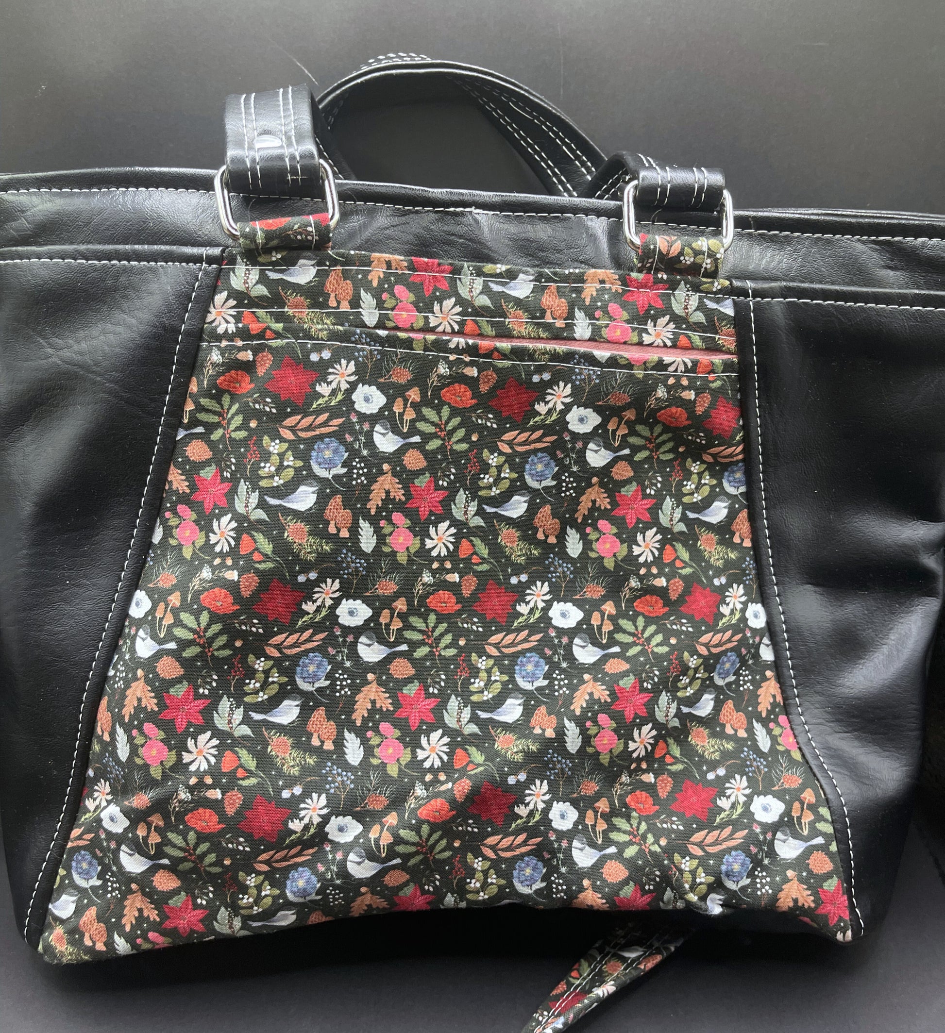 Snow Birds features a winter themed-cotton and black vinyl exterior, a salmon cotton interior, and silver hardware.