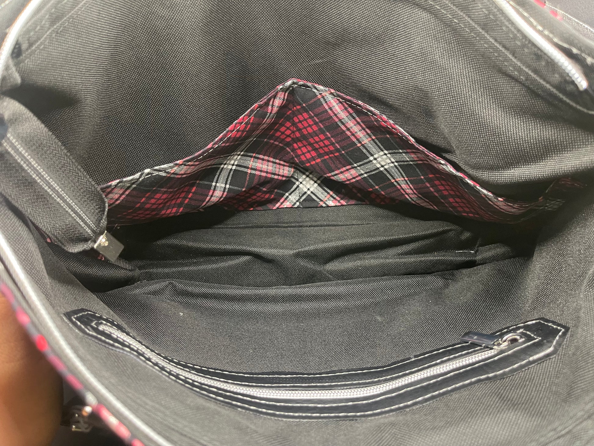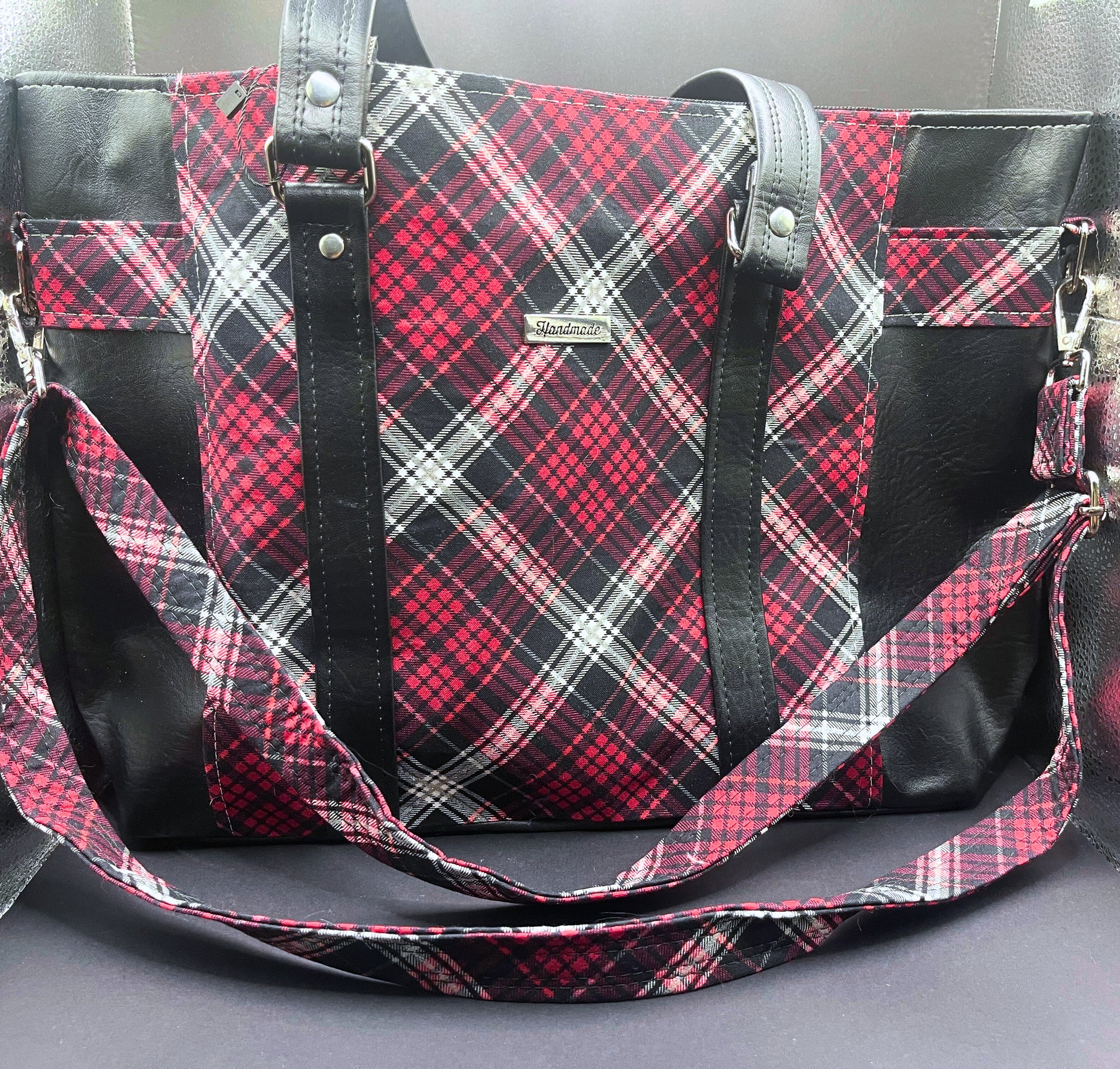 Sleigh Bells Ring features a red/black/white/ silver plaid cotton and black vinyl exterior, a black waterproof canvas interior, and silver hardware. Sleigh Bells Ring also features a beautiful silver metallic topstitching, giving a little pop of sparkle!