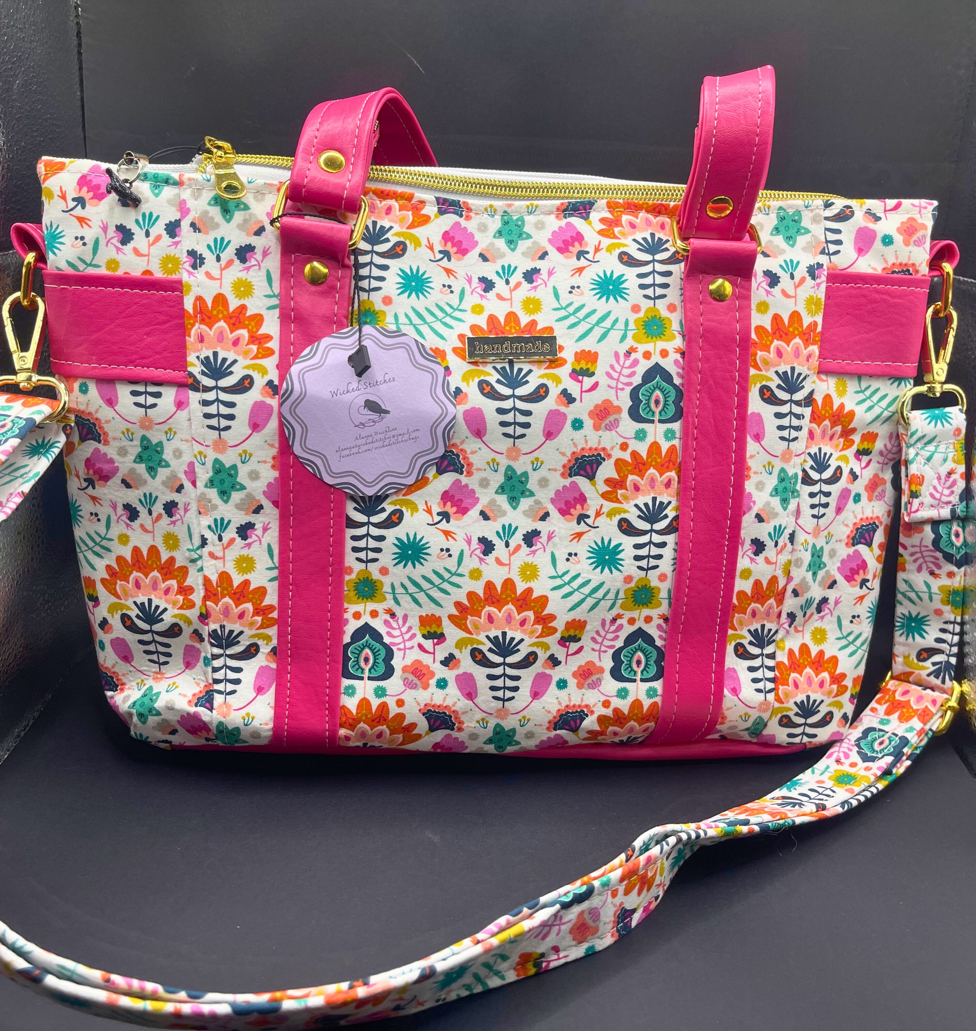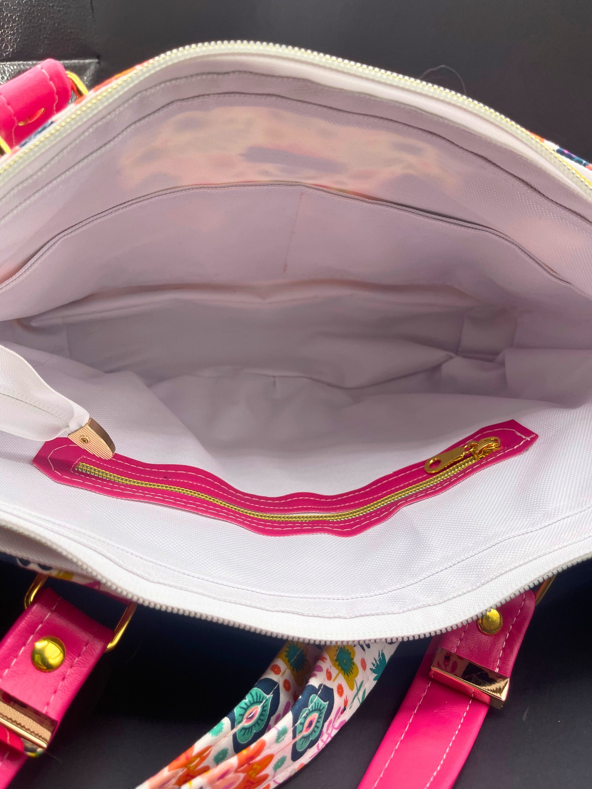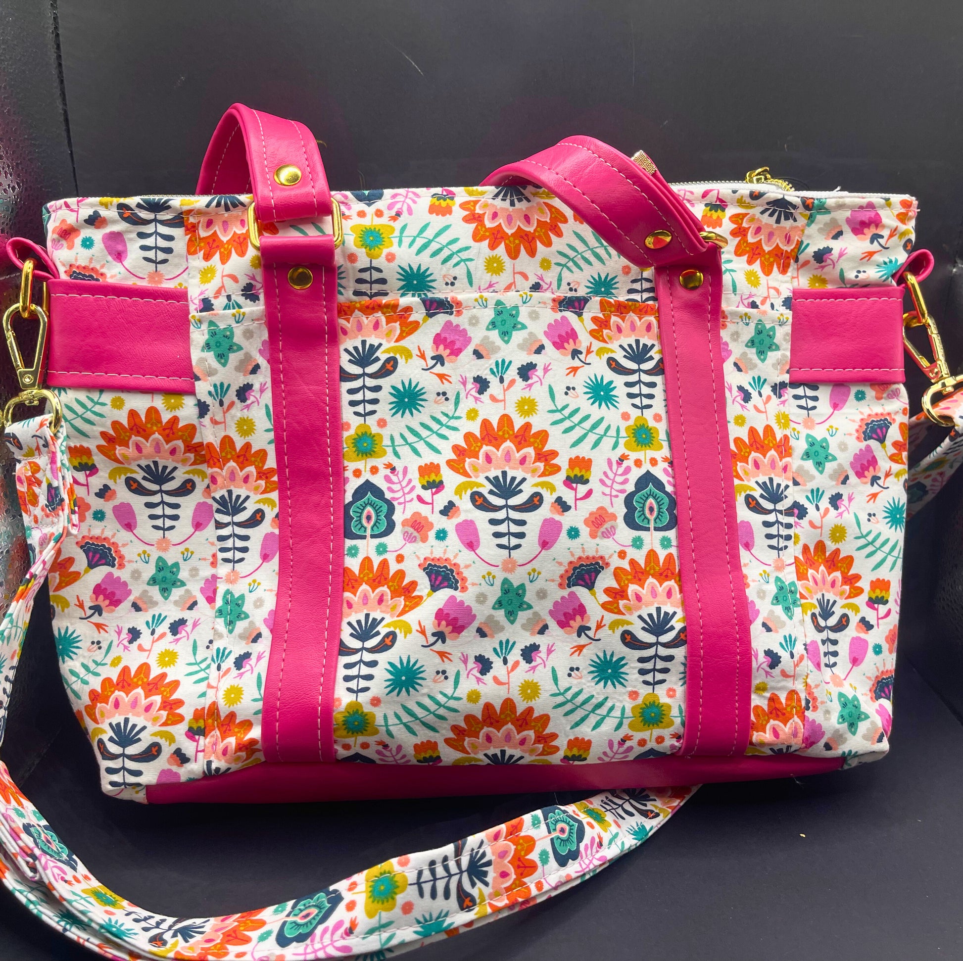 Pink, it Was Love at First Sight features a white/pink patterned cotton and pink vinyl exterior, a white waterproof canvas interior, and gold hardware.