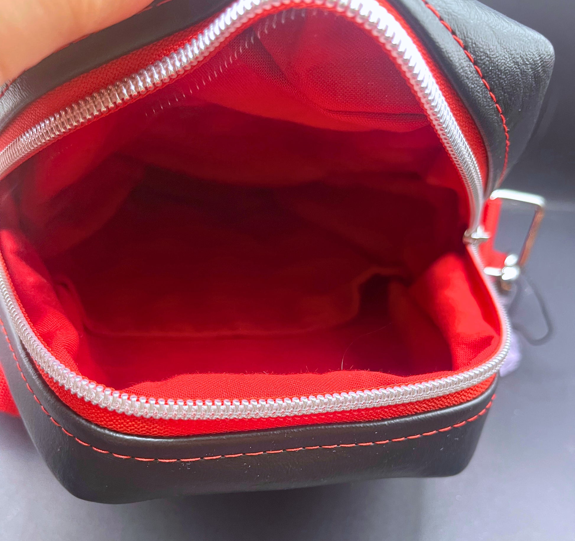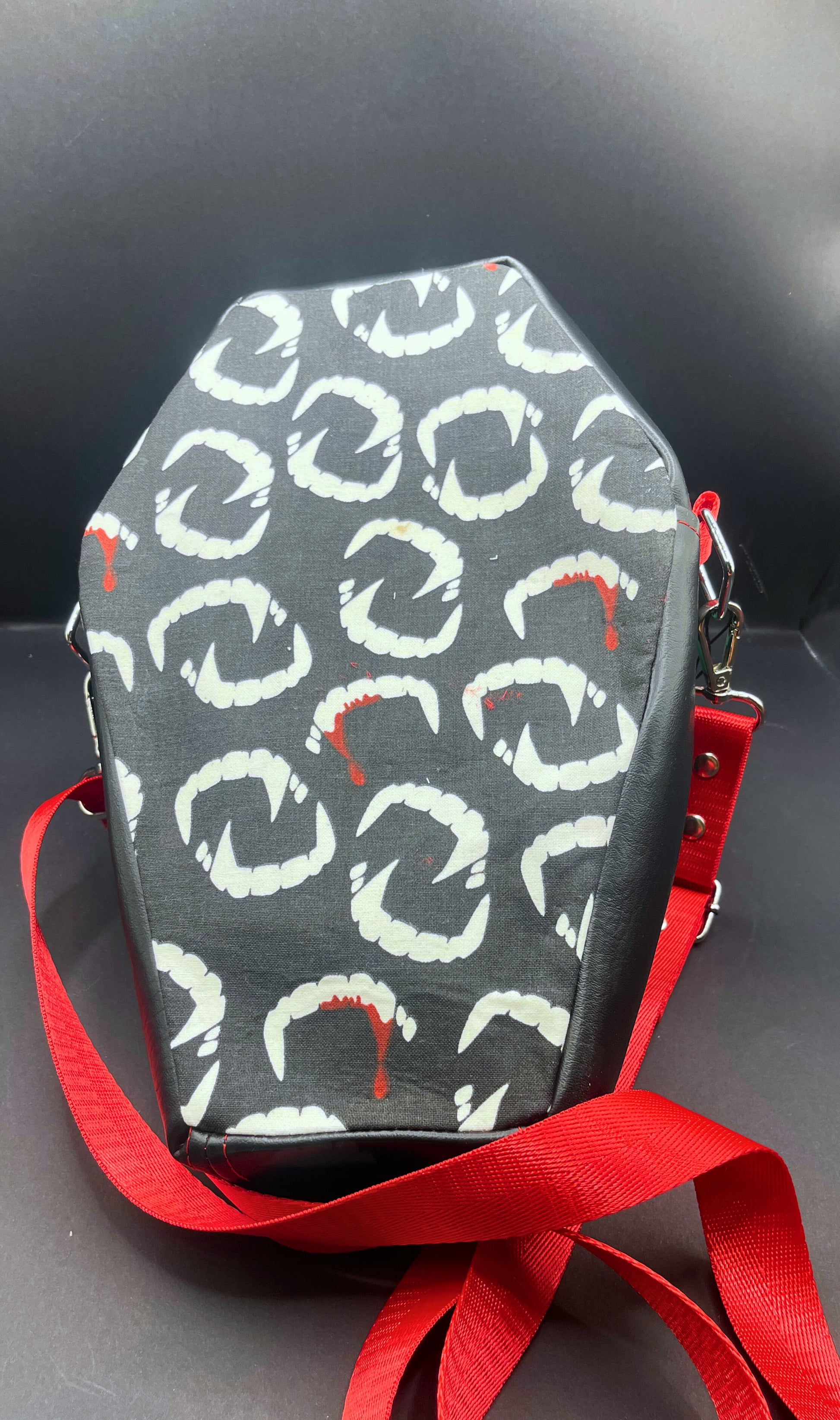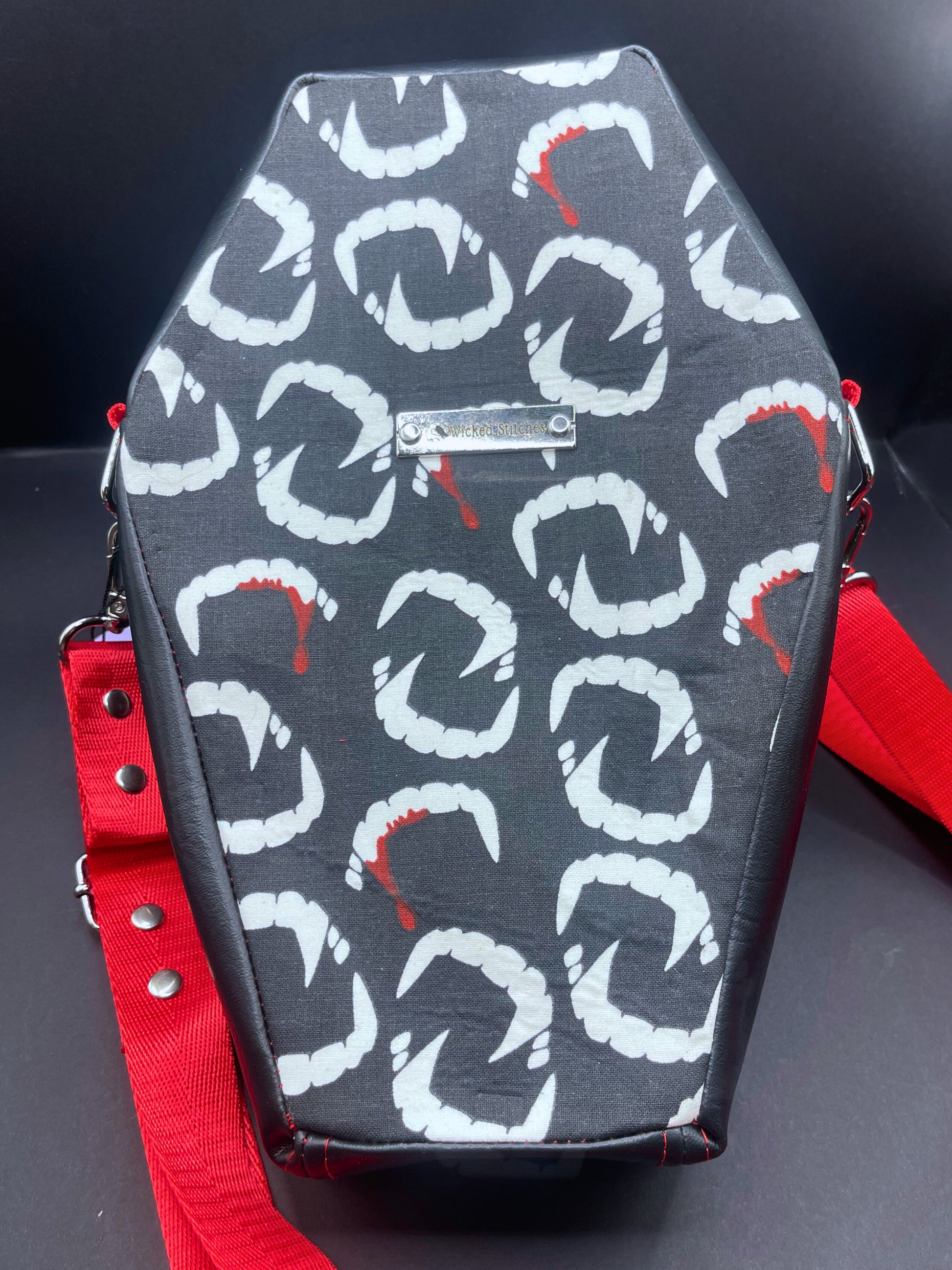 Bite Me features a black and vampire teeth-patterned cotton and black vinyl exterior, a red cotton interior, and silver hardware.